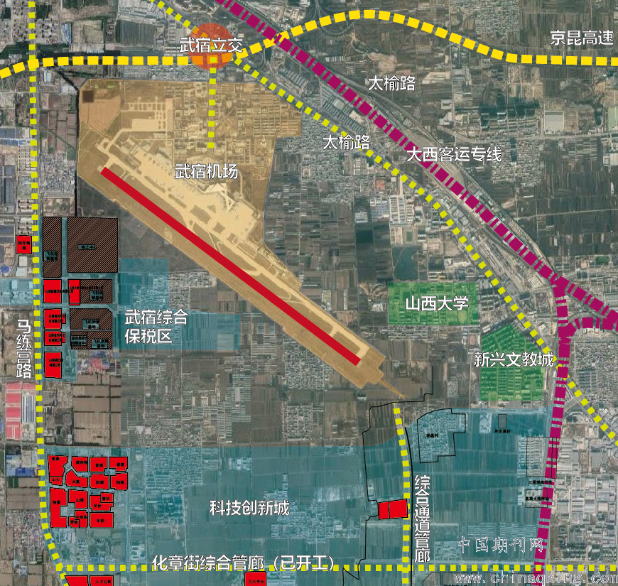 机场跑道构型决定机场总图的布局框架,是机场总体规划的核心内容,太原机场周边扩建用地被现状铁路、道路、开发地块围合,周边存在不少高层住宅楼及构筑物,扩建用地局促,可扩建范围大致为北至京昆高速,西至马练营路,南至化章街,东至大西客运专线,如下图1-1所示。