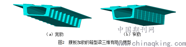 对32m双线单跨轨道交通箱型梁采取腹板加肋的措施,利用箱型梁有限元-边界元耦合声学计算模型预测腹板加肋措施对轨道交通箱型梁结构噪声辐射的影响。建立宽肋和窄肋两种工况,肋板宽度分别为0.56m和0.13m,肋板厚度0.2m,肋板中心间距均为4m。箱型梁其余结构参数及属性与原模型一致,腹板加肋的箱型梁三维有限元模型见图2所示。