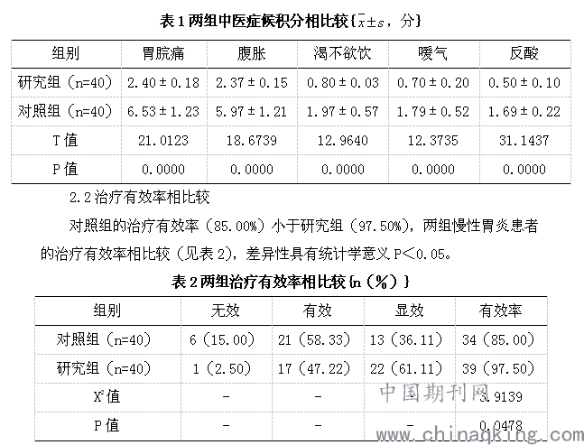 对照组的中医证候积分(胃脘痛、腹胀、渴不欲饮、嗳气和反酸)大于研究组,两组慢性胃炎患者的中医症候积分相比较(见表1),差异性具有统计学意义P<0.05。