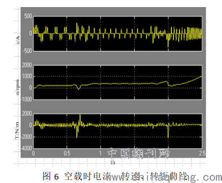 从图5和图6可见:在相同控制策略下采用分级变频方法在带额定负载、空载时起动,都能顺利起动,转矩在整个起动过程中都一直存在比较大的范围内在正、负之间波动。