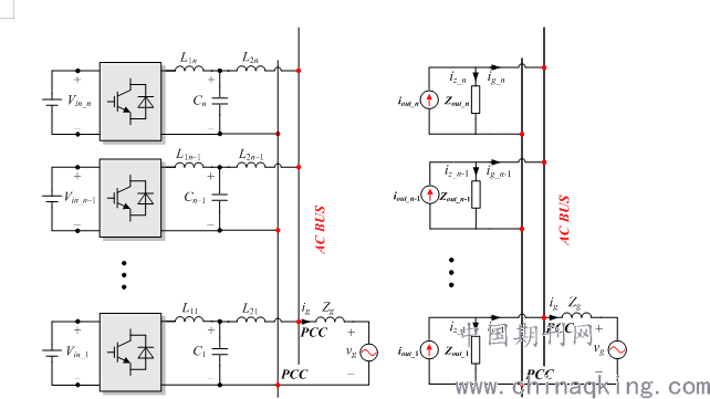 在光伏电厂或风电场中,常用单台或多台逆变器两种并网方式。由于实际向电网传输的能量很大,相对于单台逆变器并网,利用多台逆变器进行能量输送的优势在于:第一、可以用来灵活地扩大逆变器组的容量;第二、可以组成并联冗余系统以提高运行可靠性;第三、具有极高的系统可维护性,在单逆变器出现故障时,可以很方便的进行热插拔更换或维修。所以,多台逆变器并联并网在实际光伏或风电并网中被广泛采用。