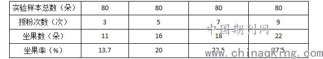 3.2随着中蜂授粉次数的增加,坐果率也明显提高,中蜂授粉3次、5次、7次、9次的坐果率分别是13. 7%、20%、22.5 %和27.5%。