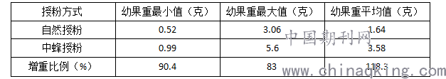 3.3红富±苹果用中蜂授粉后明显加快了幼果的生长速度,中蜂授粉1 5天后幼果平均重是3.58克,自然授粉15天后幼果平均重是1.64克。