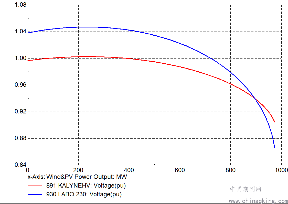 假设其他三个地区的风能和太阳能发电能力为零,即不考虑其他地区的风能和太阳能发电量变化的影响。与Kalayaan EHV,Malaya,Gumaca和Labo变电站相连接的风电场以及与Makban变电站相连的太阳能电站的PV和VQ曲线如图9所示。大多数风电场将连接到Kalayaan EHV和Labo变电站,所以KalayaanEHV和Labo变电站的电压监测如图9(上)所示。随着风电场有功出力的增加,Kalayaan EHV和Labo变电站电压先增加后减小,当风电出力达到971MW时,电压崩溃,相应的VQ曲线如图9(下)中的红色曲线所示。红色VQ曲线的最低点表明,不能再有更多的无功功率从电网注入Kalayaan EHV变电站和Labrador变电站。如图9所示,在这种情况下,Kalayaan EHV高压变电站的崩溃电压为0.90pu。 因此,考虑到10%的电压静态稳定裕度,Labrador变电站电压下限应为0.99pu,非高峰负荷情况下相应的风光互补输出上限为486MW。