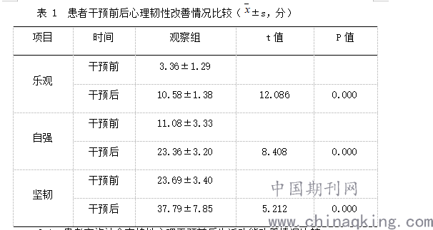 干预后,患者心理韧性评分均有明显提升且高于干预前(P<0.05)。见表1。