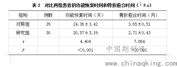 结果显示,与对照组相比,研究组患者的腕关节功能恢复时间、骨折愈合时间均缩短(P<0.05),见表2。