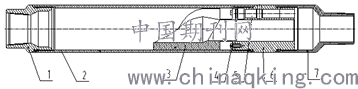 1—上接头;2—上外套;3—导向体;4—导向体固定螺栓;5—主体偏心孔;6—配水器主体;7—下接头