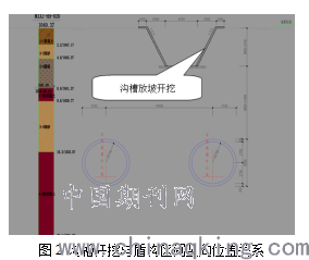 在第一段改建热力管线范围内,热力管线施工开槽深度3.8m~5.7m,开槽范围内区间右线隧道上部覆土厚度为10.6m~16.2m,开槽施工采用1:0.5放坡,直埋开挖槽底距离区间隧道拱顶净距约6.8m~11.4m;在第二段改建热力管线范围内,热力管线施工开槽深度3.3m~5.4m,开槽位置距离区间右线结构水平距离为0~9.2m,开槽范围内区间右线隧道上部覆土厚度为9.9m~13.9m,开槽施工采用局部1:0.5放坡,直埋开挖槽底距离区间隧道拱顶竖向净距约6.5m~9.2m。沟槽开挖距离盾构区间位置关系见图2。