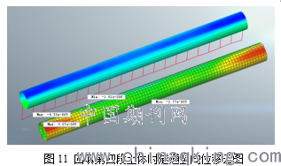 基坑开挖以后,基坑土体卸荷作用产生邻近盾构区间的竖向位移。基坑开挖完成后产生的位移最大,地铁控制区范围内基坑开挖至坑底各工况隧道典型位移云图如图4~11所示;