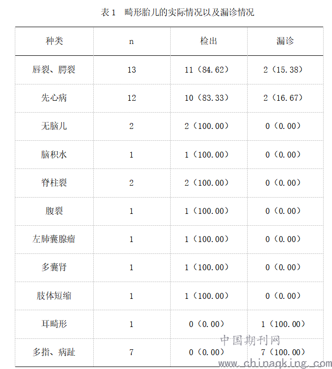 本次研究的过程中,在全部42例畸形胎儿中,超声筛查过程中确诊30例,筛查结果与产后诊断完全一致,筛查检出率为71.43%;漏诊12例,漏诊率为28.57%。畸形胎儿的实际情况以及漏诊情况详见表1。畸形胎儿存在多指并趾、耳畸形等形态较小、非致命性急性。其中,母婴保健法中要求检出的致命性畸形不存在漏诊。
