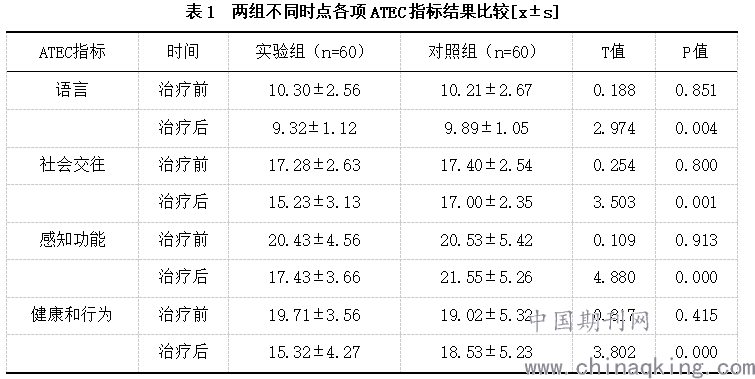 两组观察对象临床治疗前,语言、社会交往、感知功能、健康和行为等方面的ATEC指标结果差异较小,无统计学意义(P>0.05),实验组治疗后各项ATEC指标评分结果均明显低于对照组,两组数据差异对比明显,存在统计学意义(P<0.05)。如表1所示。