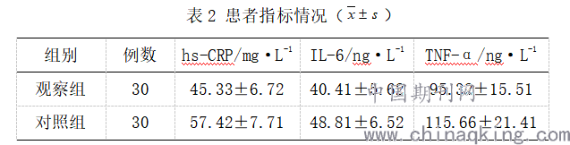 表2数据显示:经治疗,观察组患者的TNF-α水平、血清hs-CRP及IL-6均优于对照组,且差异明显,P<0.05。