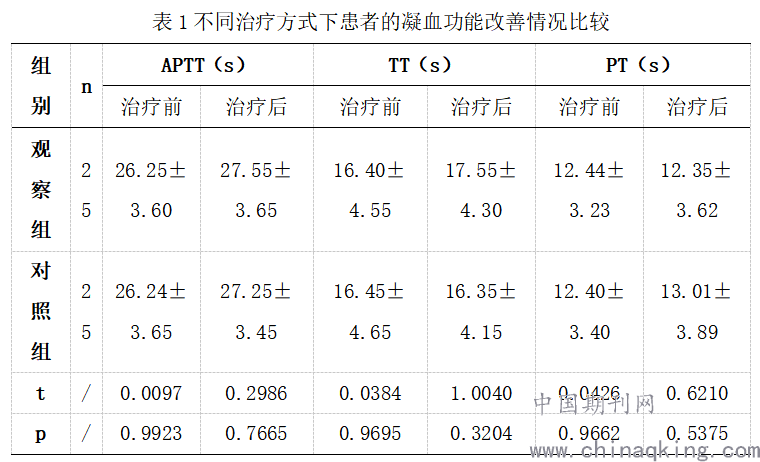 比较治疗前后两组患者的凝血功能,在指标APTT,TT,PT上均无统计学差异(p>0.05)。见表1: