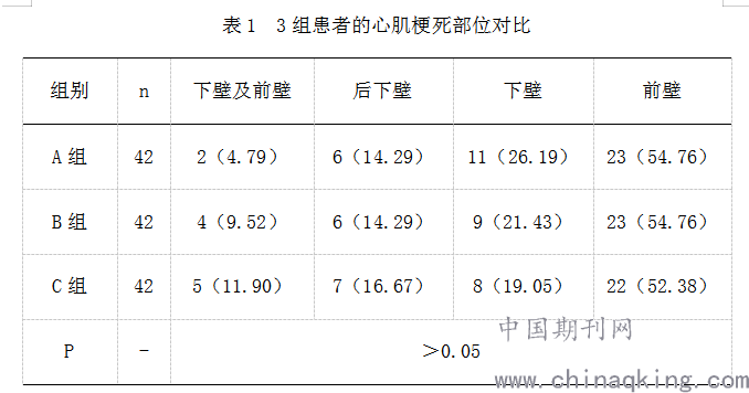 本次研究的过程中,重点对3组患者的心肌梗死部位以及心脏超声检查指标进行了解。