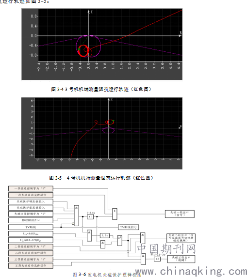 结合3、4号机机组故障录波进行定量分析,在3号机失磁保护动作前3个周波至保护动作,有功、无功均为负值,期间相电流有效值在0.1-0.18A之间小幅度变化,电压有效值在5.5-5.8V之间小幅度变化,励磁电压保持在-56V左右,机端测量阻抗运行在P-Q(R-jx)图第三象限静稳圆内,满足发电机失磁保护动作条件,加上转子低电压一直满足,因此发电机失磁保护动作。3号机机端测量阻抗运行轨迹如图3-4。