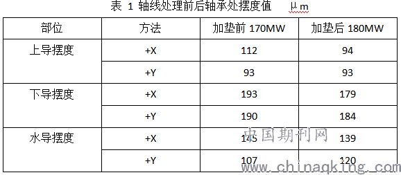 重新分配瓦间隙的轴承恢复后,机组经过带负荷运行试验,下导瓦温偏高的顽疾得到完美解决,平均温度下降4℃以上。机组各轴承处摆度均小于允许摆度值300μm,且比轴线处理前摆度值减小(见表1),达到优良标准。