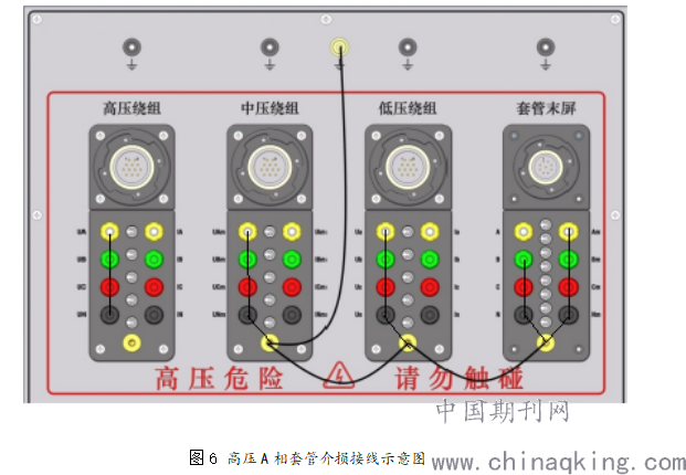 集成装置面板上高压绕组1至4号屏蔽开关闭合、5号屏蔽开关断开,再用短接线把A相、B相、C相、O相短接;中压绕组、低压绕组将所对应全部屏蔽开关闭合进行短接,套管末屏将A相闭合开关断开,并将其余屏蔽开关全部闭合短接,通过短接线接地(注意接地短接线不得碰触高压线及外壳),如图6所示,介损仪高压线接至高压短接端子,屏蔽线接屏蔽端子,Cx信号线接套管末屏A相。