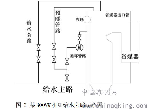 图2为某300MW机组锅炉给水旁路改造的示意图,该方案通过使用锅炉下降管内的高温度水加热给水主路的给水,提高了进入省煤器的给水温度,同时给水旁路的分流也使进入省煤器的给水流量降低,因此大幅度减少了高温烟气与省煤器之间的换热量。该系统通过增加循环泵解决了锅炉与省煤器给水不畅的问题,能够实现并网后快速投入全负荷SCR运行。
