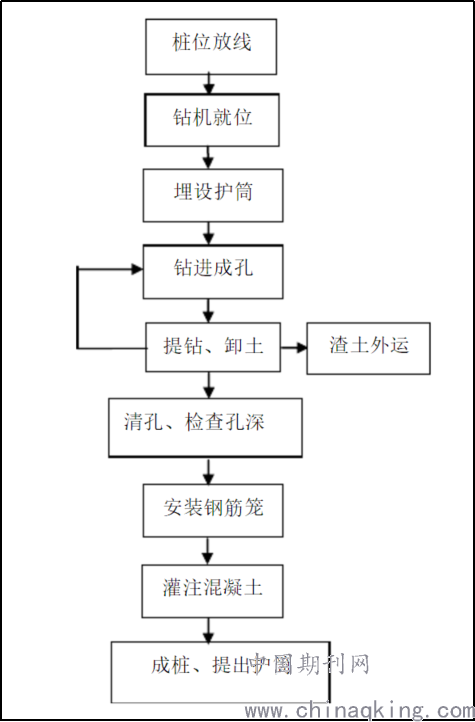 平整场地→测量放线→埋设护筒→钻机钻头对正桩中心→成孔钻进至设计桩底→吊装钢筋笼→下导管→灌注混凝土→拔导管→钻机移位→养护