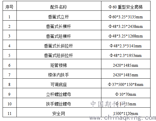 该类安全爬梯由特制钢管脚手架搭设组成的脚手架组合。该脚手架组合主要构件为可调底座、立杆、横杆、横撑、斜杆、梯子、扶手、紧固螺丝。立杆是主要受力杆件,横杆、横撑是组成框架的横向连接杆件,横撑是放置梯子的构件。斜杆是加强脚手架整体稳定性的构件。梯子和扶手是供施工人员上下通行的构件。(详见图1.1)该脚手架组合主要构件其主要参数如下: