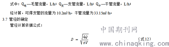 经计算,支管管径为54.84mm,选用PE60级管0.8MPa公称压力下的dn75,壁厚5.6mm,内径为63.8mm,可以满足过流要求;干管管径为98.87mm,选用PE60级管0.6MPa公称压力下dn125,壁厚7.1mm,内径为110.8mm,可以满足过流要求;毛管的内径选取12mm,壁厚0.16mm的PE管。