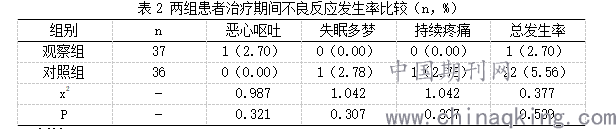 观察组患者治疗期间不良反应发生率与对照组无差异(P>0.05),见表2。