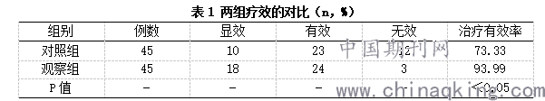 对照组与观察组应用不同的治疗方式后,在疗效方面以观察组疗效显著高于对照组为对比结果,见表1。