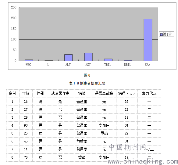摘要 目的:通过对8例确诊患者检验数据分析,探讨新型冠状病毒肺炎对机体创伤破坏能力及其与患者个体特征、病情、毒力代际等的关系,为临床早干预早治疗提供依据。 方法:通过病历查阅的方式,回顾性收集8例确诊患者一般人口学特征、武汉旅居史、疾病史、新型冠状病毒肺炎病情严重程度及病程和新型冠状病毒毒力代际,主要采用描述性分析的方法分析不同患者住院期间主要临床检验指标的时间变化趋势。 结果:患者康复的快慢与个体体质及有无基础疾病、年龄、病毒毒力明显相关。结论:在诊治期间密切关注检验结果变化,结合个体差异,真正实行一人一策,早治疗,早康复,提高诊治率。