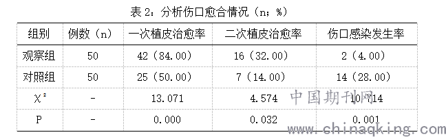 观察组骨科创伤创面感染患者一次植皮治愈率、二次植皮治愈率均高于对照组、伤口感染发生率低于对照组,P<0.05。如表2: