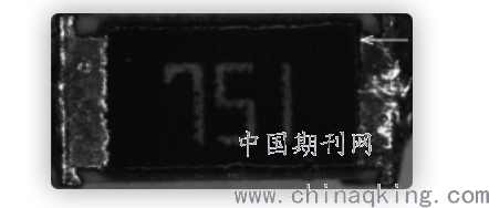 电源模块输出异常,是内部3.6W表面贴装电阻器开路故障引起的。观察失效表面贴装电阻的外观,未见明显裂纹等异常现象。用万用表测试失效电阻,电阻值为无穷大。用X射线检测仪检测其抗破坏性能。结果表明,失效电阻在电阻中间位置附近有熔断痕迹,其余部位未见明显异常。用化学方法除去电阻表面的玻璃釉,露出电阻膜。主要观察结果为:电阻中间电阻膜有气泡和裂纹,未发现其它异常现象(如图4所示)。由此推断,失效电阻在使用过程中受到过电流应力的作用,导致中间电阻调节部分过电流烧毁,导致电阻开路状态。