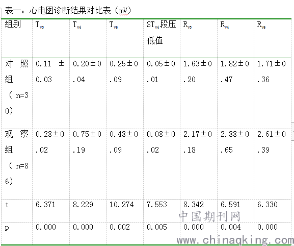 观察心电图诊断结果,以导联心电图数值情况作为对比项,观察组间数据差异,并总结观察组研究对象的心电图特点。
