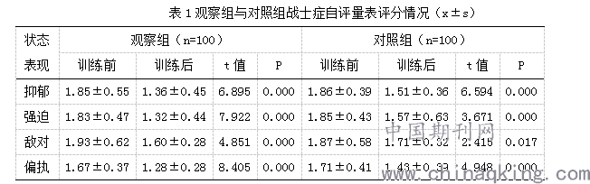 本次实验所涵盖的对象是2019年新入伍的战士200例,依照单双数法将新战士随机分为观察组和对照组,每组新战士的数量为100例。观察组战士的平均年龄是(19.93±0.23)岁;患者经入伍前体检并无既往精神类疾病。对照组战士的平均年龄是(19.54±0.56)岁;患者经入伍前体检并无既往精神类疾病。两组战士从年龄、精神状态等方面进行对比并无明显差异,差异无统计学意义(P>0.05),具有可比性。