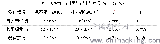 将两组新战士训练伤的情况进行对比以后可以发现,观察组战士出现骨关节受伤的例数是6例(6%),软组织受伤12例(12%),器官损伤2例(2%);对照组战士出现骨关节受伤例数为15例(15%),软组织受伤29例(29%),器官损伤9例(9%)。两组战士训练伤数据对比差异显著,差异具有统计学意义(P<0.05)。