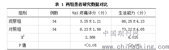 观察组与对照组患者观察指标为VAS疼痛评分、生活能力、治疗有效率。