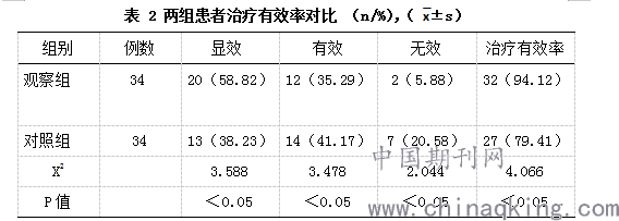 如表二所示,观察组患者治疗有效率高于对照组,组间差异显著(P<0.05)。