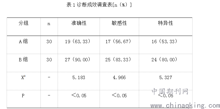 在敏感性、准确性以及特异性方面,B组均高于A组(见表1),P<0.05。