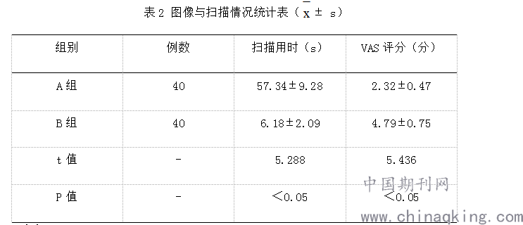 B组图像质量比A组高,且扫描时间比A组短(见表2),P<0.05。