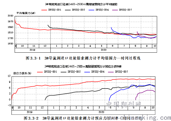 从图3.3-1~图3.3-2可知:锚索测力计(DP3DJ-X01~DP3DJ-X02、DP3DJ-X04、DP3DJ-X07)取得基准值后约1个月时间内锚索锚固力损失较大,锚固力变量量介于-117.68kN(DP3DJ-X01)~-46.18kN间,预应力损失率介于2.40%~5.87%(DP3DJ-X01)间;锚固力损失主要原因:①该部位地质构造以次级小断层、节理裂隙为特征,发育三组微张夹泥膜优势节理裂隙;②受临近部位锚索张拉使先张拉锚索测力计所在围岩进一步受压,微张夹泥膜优势节理裂隙逐渐被压实。