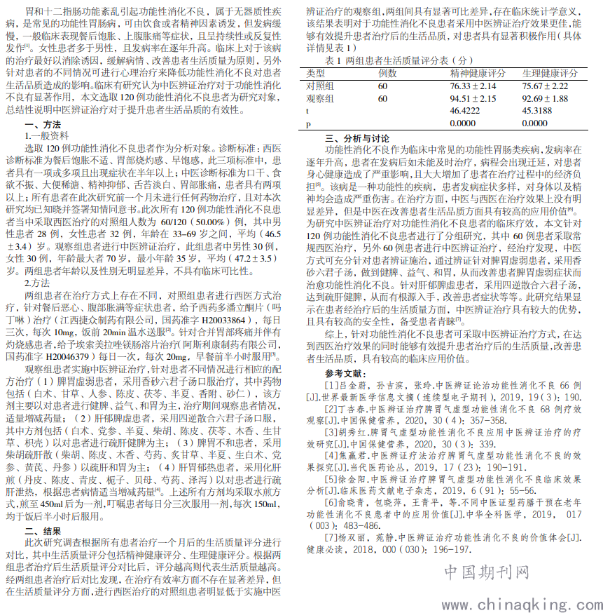 【摘要】目的 功能性消化不良症状在临床中尤为常见,属消化内科疾病,在患者发病后,对患者的生活可产生严重影响。方法:本次我 院选取 120 例功能性消化不良患者作为研究对象并对采用不同治疗方式的治疗价值进行研究,对 120 例患者根据随机数字表法进行分组,分为 对照组和观察组,两组各 60 例患者,对照组患者采用西医方式治疗,观察组患者进行中医辨证治疗。结果:经治疗一个月后,对两组患者的 生活质量评分进行分析比较后发现,采取中医辨证治疗的观察组患者生活质量评分明显高于进行西医治疗的对照组,两组间存在明显差异。结 论:此结果意味着观察组患者进行中医辨证治疗效果更好,该治疗方式能够有效提升患者接受治疗后的生活质量,可在临床中广泛推广应用。