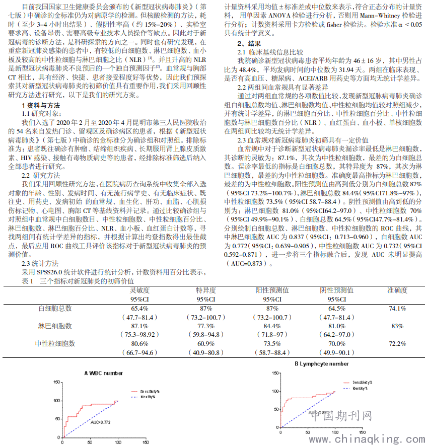 【关键词】新型冠脉病毒肺炎 血常规 诊断价值