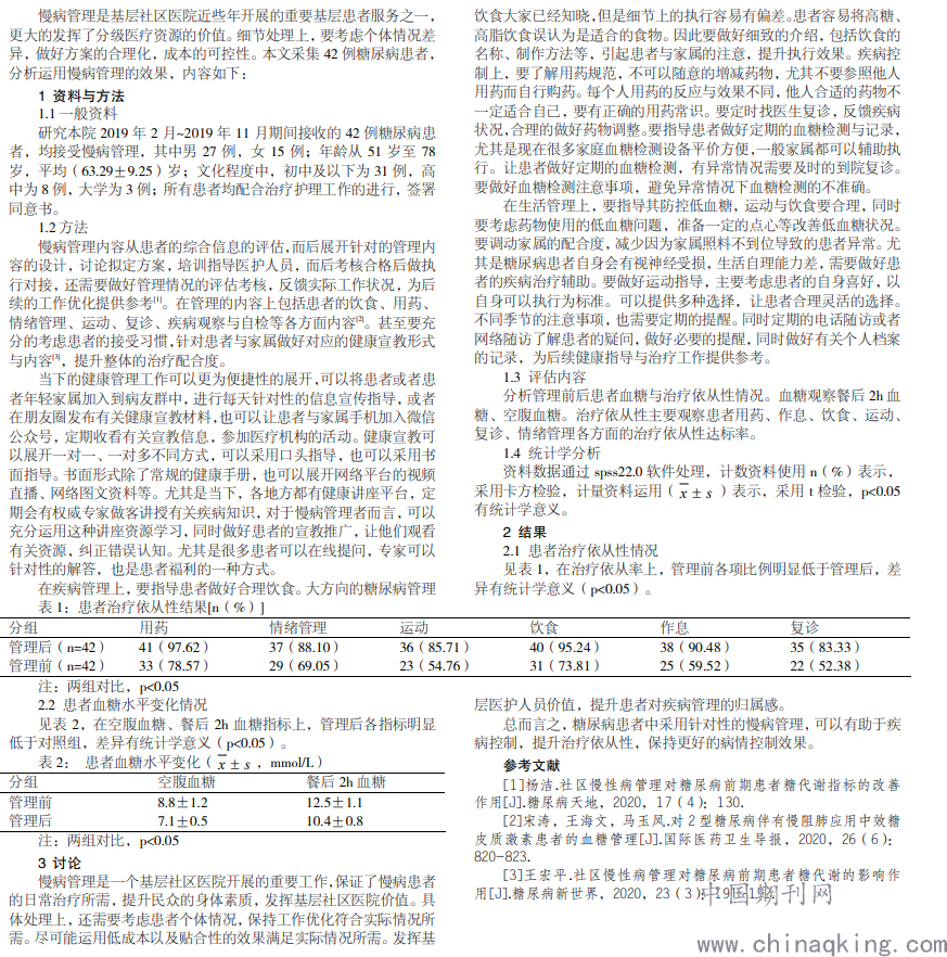 【摘要】目的:探讨糖尿病患者慢病管理的效果。方法:研究本院 2019 年 2 月~2019 年 11 月期间接收的 42 例糖尿病患者,均接受慢病 管理,分析管理前后患者血糖与治疗依从性情况。结果:在空腹血糖、餐后 2h 血糖指标上,管理后各指标明显低于对照组,差异有统计学意 义(p<0.05);在治疗依从率上,管理前各项比例明显低于管理后,差异有统计学意义(p<0.05)。结论:糖尿病患者中采用针对性的慢病管理, 可以有助于疾病控制,提升治疗依从性,保持更好的病情控制效果。