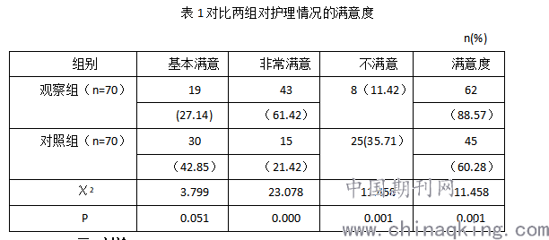 观察组护理情况的满意概率为88%明显低于对照组62%的概率,差异有统计学意义(P<0.05)。见表1。