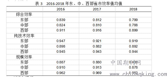 比较2016-2018年东部(11省市)、中部(8省市)、西部(12省市)的综合效率值、纯技术效率值以及规模效率值的均值。如表3。东部、中部、西部的综合效率在近三年都有小幅度的降低。东部、中部西部的纯技术效率与规模效率在近三年几乎不变。规模效率呈现西部最高,中部次之,东部最低。纯技术效率与综合效率均呈现西部最高。说明西部相较于中、东部无论是技术还是管理、产出等都好一些。