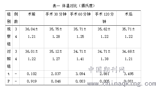 2.1术前,两组患者的体温无较大差异,手术30分钟、手术60分钟、手术120分钟、术后,观察组患者的体温高于对照组,两组数据存在统计意义(P<0.05)。如下表: