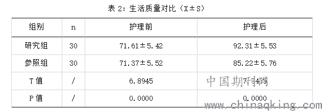 研究组护理后生活质量评分明显更优,P<0.05,差异有统计学意义。如表2所示。
