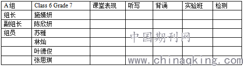 初中英语教学中,都是大班化教学,平均每个班级有50个学生,每位老师任教两个班级,在面对两个班级100多位学生很难照顾到每位,但是学生之间是最了解彼此的。有些学生兴趣相同,爱好一致,座位相邻,只是学习水平和能力存在差异,这样几个学生可以分在一组,实现小组内部成员之间的优势互补,协调小组稳定发展,最重要的是促进学困生的转化。在小组合作学习中,教师要对学生进行明确的分工,让每个学生分别担任不同的角色,一般情况下一个小组有6名成员,有男生也有女生,正副组长各一名,中等生两名,学困生两名。并把班级分成几个小组,在接下来的学习中,班级的几个小组之间以各组为一个团体相互竞争,在相应的任务完成后,根据完成的情况给与各组一定的奖励,对于没有完成相应任务的小组要鼓励,对于每组中的学困生进步显著者给与本组所有的成员相应的奖励。小组合作能有效促进学生英语学习的兴趣,尤其是对于学困生而言,在平时的学习中,不懂的题目可以问组长、副组长或是自己小组的成员,既明白了问题有促进了同学间的友谊,在背诵英语单词、课文这一老大难问题前面,可以实行小组成员之间互背,然后教师在平时的教学中抽背某几个学生即可,既减轻了教师的负担,又能让学生有效的完成背诵任务。比如在七年级开学一段时间后,学生之间经过一段时间学习相处,大概知道彼此之间的兴趣爱好,老师通过上课、作业情况和测试成绩也大致上了解学生之间的差异,这就意味着可以开始分组。在我任教的班级,一共有54名学生,我把这些学生分成9个小组。例如A组: