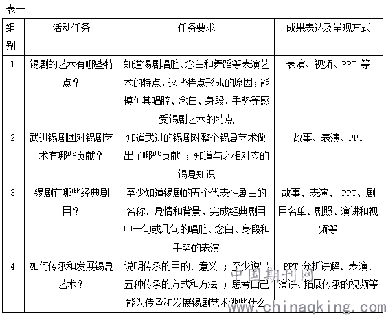 活动重点 :学习本土地方戏——锡剧艺术的相关知识和基本技能,明确传承锡剧艺术的目的和意义 ;培养学生自主学习中的合作、思考能力,收集、整理材料的能力以及表演、处理信息和语言表达的能力。