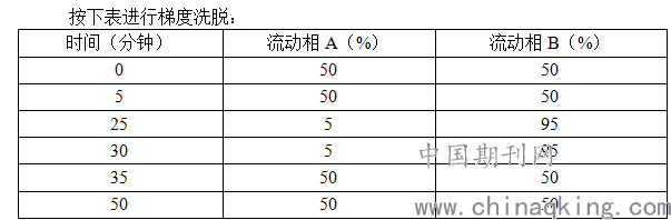 方法:色谱柱:Dionex CarboPacTM PA1预柱,Dionex CarboPacTM PA1色谱柱,4×250mm;柱温:25℃;1.0ml/min;检测波长:210nm;进样量:100μl;流动相:流动相A为二甲亚砜磷酸盐缓冲液溶液【1000ml磷酸盐缓冲液中加入约15±10μl二甲亚砜,如基线产生正相漂移,则增加二甲亚砜的用量,反之则减少二甲亚砜的用量,二甲亚砜的实际用量为5~25μl不等】;流动相B为2.0mol/L氯化钠磷酸盐缓冲液溶液【取0.210g磷酸二氢钠二水物和0.650g磷酸氢二钠二水物用水溶解,然后稀释至1000ml,用磷酸调节溶液pH约为7.3】。