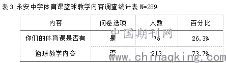 从问卷调查和3.1.3专项调查可知道,永安中学专职篮球教师没有,课程开展篮球课的班级也是少数。
