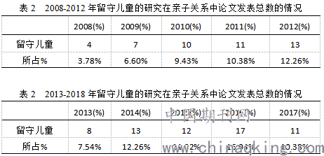 利用web of science数据库文献的检索系统,以parentage和parenthood为主题,检索外文文献上2008年—2018年近10年的论文,根据文章的内容对检索到的论文进行筛选,最终得到亲子关系的总论文3861篇;再以stay-at-home children和left-behind children为主题,检索到留守儿童的论文2篇,文章主要是从家庭经济的角度出发,由于受家庭经济状况的制约,造成一部分华裔的家庭的子女从小随着长辈一块生活,而不是和父母亲生活在一起,或者说生活在一起的时间很少。文献调查显示,这部分留在家里和长辈在一块生活的孩子,由于受到社会环境的影响,跟一般的孩子相比,更具有独立意识;与同龄的孩子相比较,表现的更加的成熟,更加的能够处理好自己的关系,同时在学习上更加具有主动性,积极性;在与父母的关系上,显得不是特别亲昵,也没有表现的特别生疏,在父母面前,自主意识表现的更加明显。
